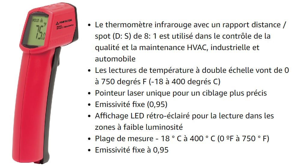 • Le thermomètre infrarouge avec un rapport distance / spot (D: S) de 8: 1 est utilisé dans le contrôle de la qualité et la maintenance HVAC, industrielle et automobile • Les lectures de température à double échelle vont de o à 750 degrés F (-18 à 400 degrés C) • Pointeur laser unique pour un ciblage plus précis • Emissivité fixe (0,95) • Affichage LED rétro-éclairé pour la lecture dans les zones à faible luminosité • Plage de mesure - 18 °C à 400 °C (°F à 750 °F) • Émissivité fixe à 0,95