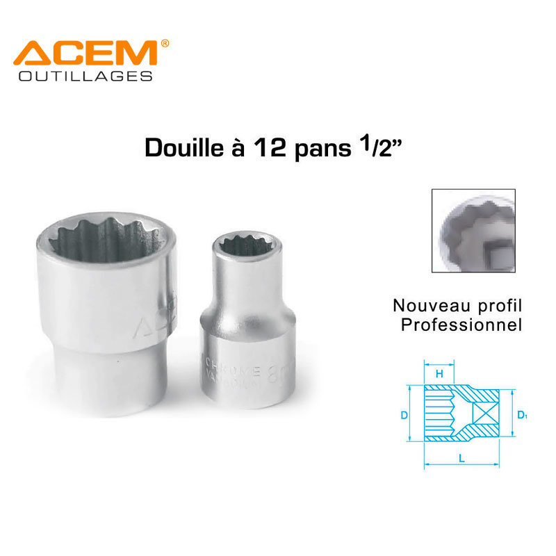 DOUILLE-1/2-12PTS-11MM ?acier chrome vanadium ?présentation : chromée ?pour usage manuel uniquement ?Marque : ACEM