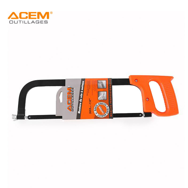 Monture de scie à métaux avec une poignée confortable en plastique dure et une peinture en époxy. Une lame de 300 millimètres. Marque : ACEM