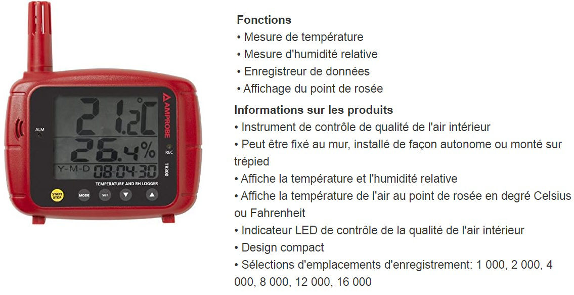 Fonctions • Mesure de température • Mesure d'humidité relative • Enregistreur de données • Affichage du point de rosée Informations sur les produits • Instrument de contrôle de qualité de l'air intérieur • Peut être fixé au mur, installé de façon autonome ou monté sur trépied • Affiche la température et l'humidité relative • Affiche la température de l'air au point de rosée en degré Celsius ou Fahrenheit Indicateur LED de contrôle de la qualité de l'air intérieur • Design compact • Sélections d'emplacements d'enregistrement: 1 000, 2 000, 4 000, 8 000, 12 000, 16 000