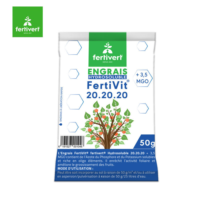 -Engrais hydrosoluble fertivit 20-20-20 +3.5 MGO contient de l’Azote de Phosphore et du Potassium solubles et riche en Oligo éléments