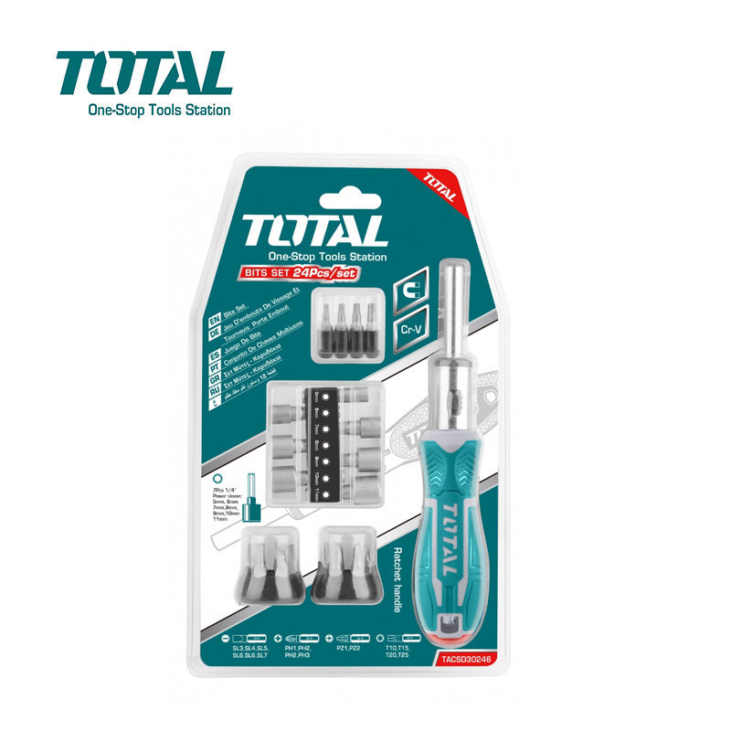 TOURNEVIS À CLIQUET À PRESSION AVEC JEU D'EMBOUTS ET DOUILLES INCLUS Matériau : acier au chrome vanadium, poignée en plastique et caoutchouc Tournevis : cliquet à deux voies Système de montage facile des embouts : oui Embout de tournevis cassé : oui16 embouts de tournevis PCS 6.35X25MM:SL3, SL4, SL5, SL6, SL7, PH1, PH, PH3, PZ1, PZ2, T10, T15, T20, T257PCS 1/4 " POWER SLEEVE:5MM, 6MM, 7MM, 8MM, 9MM, 10MM, 11MMPOIGNEE DE ROCHET 1PCSOutils à main Type: TournevisMarque: TotalJeu de 24 tournevis16 embouts de tournevis 6.35X25mm:SL3, SL4, SL5, SL6, SL6, SL7, PH1, PH2, PH2, PH3, PZ1, PZ2, T10 , T15, T20, T257pcs 1/4 "Power Sleeve :5mm 6mm 7mm 8mm 9mm 10mm 11mm1pcs poignée à cliquet Emballé par double bliste