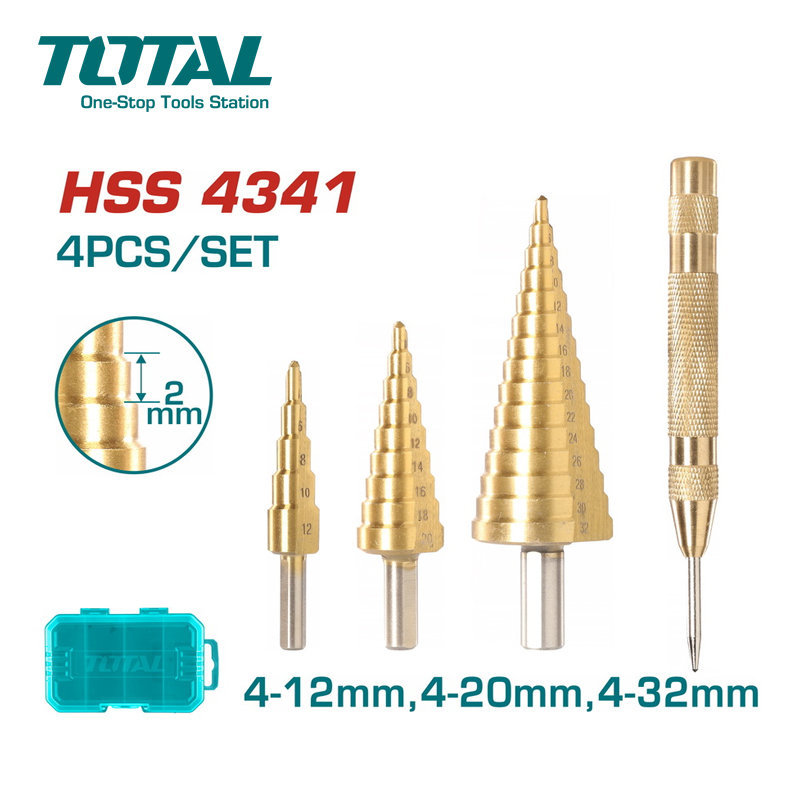 Le coffret TACSD2041 comprend 3 forets à étages HSS 4341 et un poinçon central automatique, parfaits pour les travaux de perçage progressif et le marquage précis. Grâce à leur conception étagée (2 mm par palier), ces forets permettent un ajustement rapide du diamètre sans changement d'outil, sur métal fin, plastique ou bois.