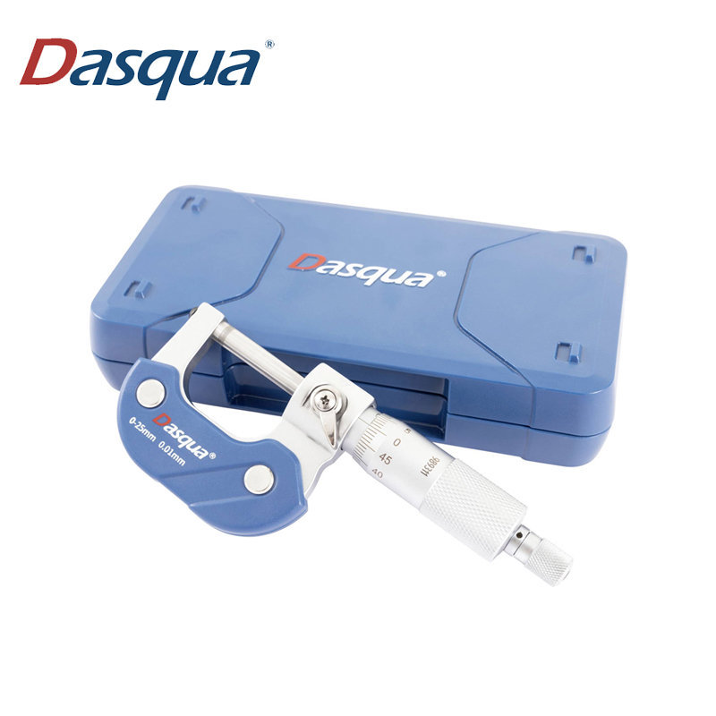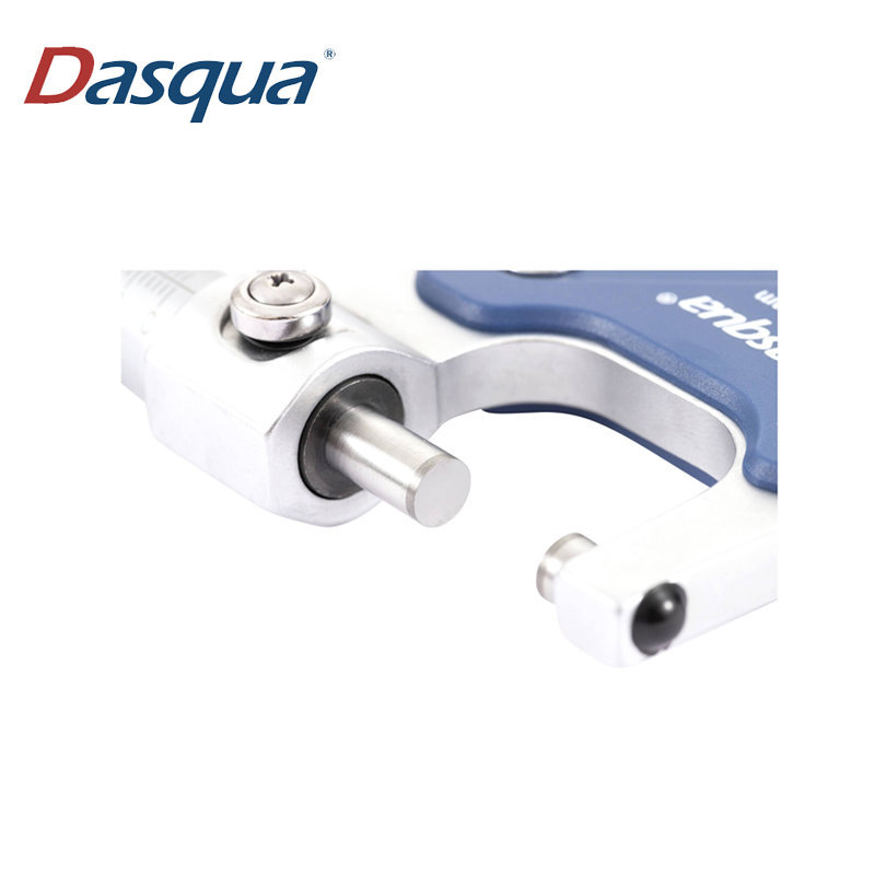 Micromètre d'extérieur Dasqua 4111-5205, conçu pour des mesures précises avec une lecture de 0.01 mm. Sa surface chromée satinée est marquée pour une identification facile des mesures. La protection thermique intégrée empêche les déformations et assure une stabilité accrue lors de l'utilisation. La butée à cliquet métallique garantit des forces de mesure constantes, ce qui contribue à la précision des résultats.
