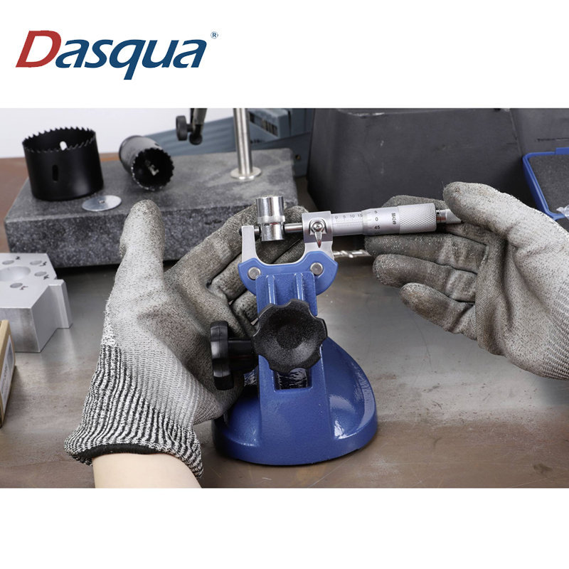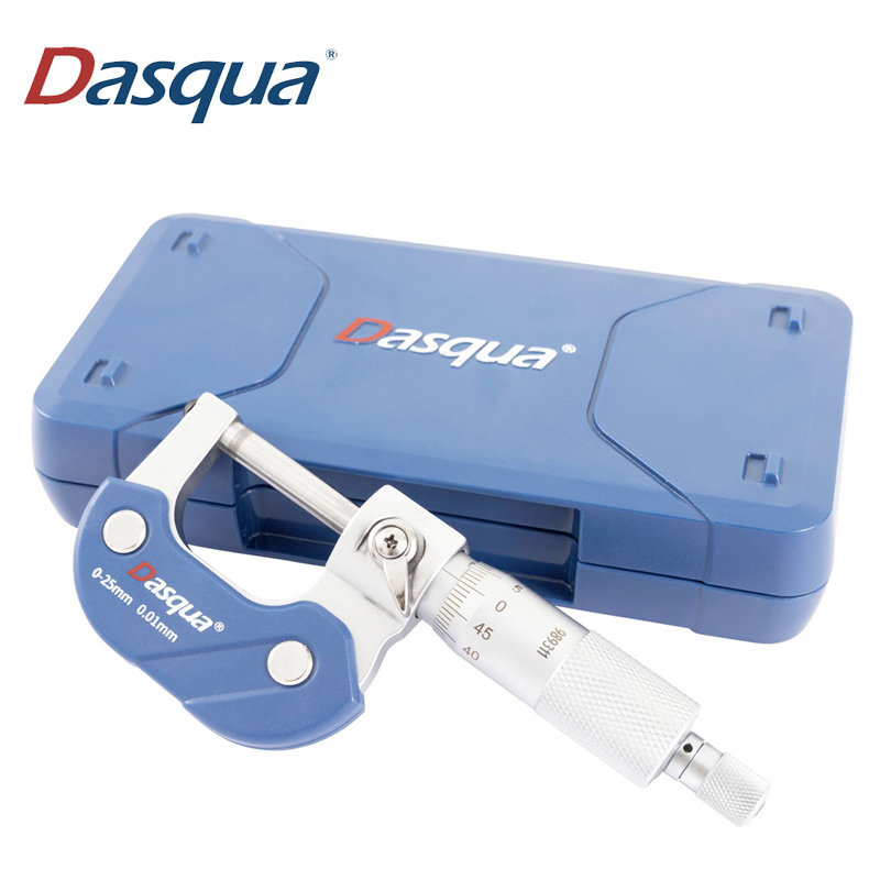 Micromètre d'extérieur Dasqua 4111-5210, conçu pour des mesures précises dans la plage de 25 à 50 mm. Sa surface chromée satinée est marquée pour une identification facile des mesures. La protection thermique intégrée empêche les déformations et assure une stabilité accrue lors de l'utilisation. La butée à cliquet métallique garantit des forces de mesure constantes, offrant ainsi des résultats fiables.