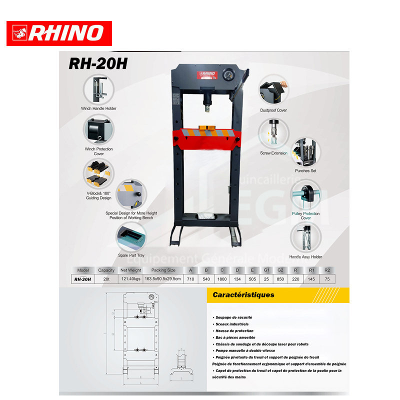 Cet appareil possède 6 niveaux de réglage de la hauteur du plan de travail – cette configuration permet de régler facilement la hauteur de la surface de travail. La pression de cette presse hydraulique est de 20 tonnes.