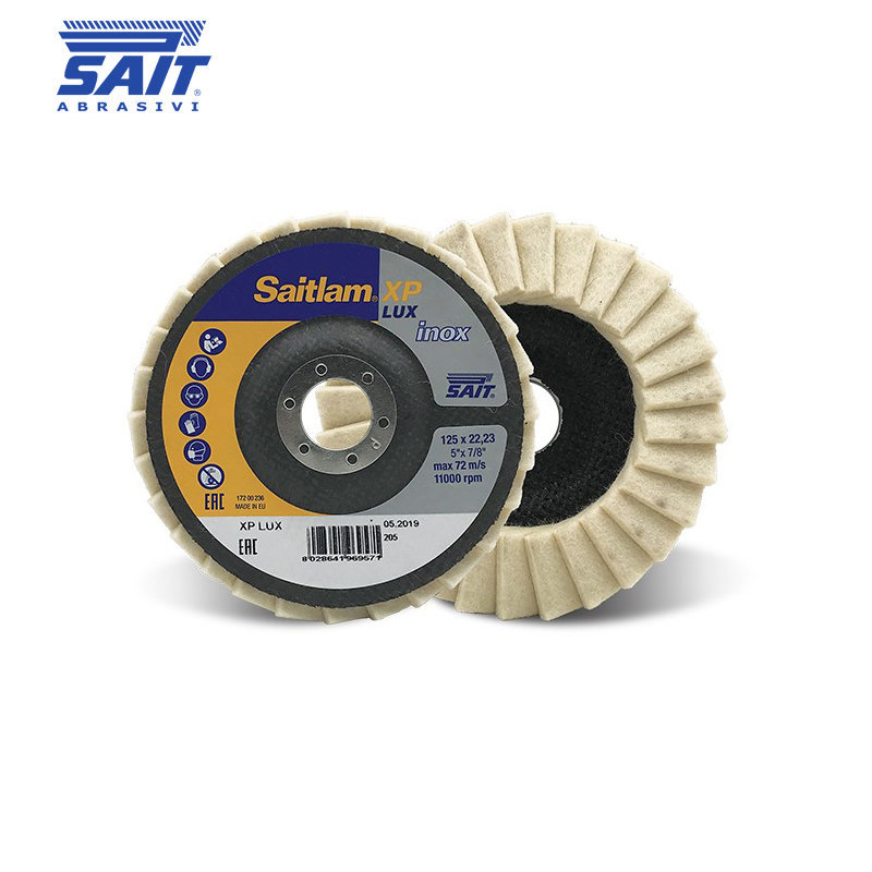 Disque feutre à lamelles en pur coton pour le polissage miroir de l’acier inoxydable. A utiliser avec les pâtes à polir SAITLAB Inox. Peut être également utilisé sur l’aluminium et les métaux non ferreux. SAITLAM XP-LUX 125 x 22,23
