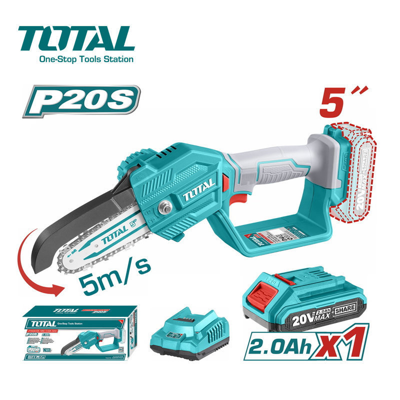 Scie électrique sans fil TOTAL TGSLI20581. La tronçonneuse Total est conçue pour la coupe rapide de bois frais, secs et humides de différentes épaisseurs et configurations, de panneaux de particules, de bois de bûches de petite et moyenne taille.