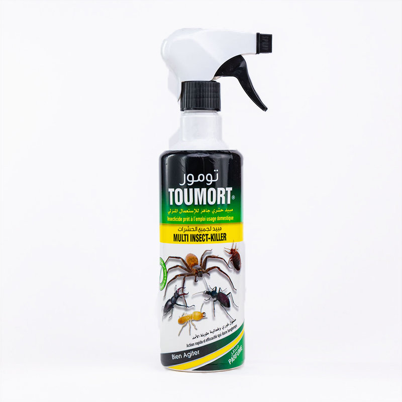 TOUMORT Multi Insectes est un insecticide sous forme d’émulsion Sans malodorante et parfumé prêt à l’emploi qui agit par contact et ingestion contre tous les types des cafards et les blattes (germanique, oriental, American). TOUMORT Multi Insectes est un insecticide à un effet choquant et mortel immédiat. TOUMORT Multi Insectes est composé de deux matières actives: la tétraméthrine comme agent choquant qui paralyse l’insecte et empêche immédiatement son mouvement et la cyperméthrine comme agent mortel et le (PBO) améliorent. Bouteille spray 500 ML.
