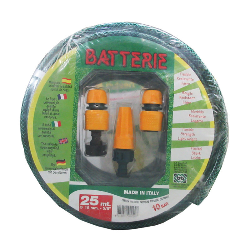 Batterie Arrosage - Tuyau universel de quilité équipé d'une lance et deux raccords - Tuyau d'arrosage - Longueur 25 m - Diamètre 15 mm - Couleur Vert .